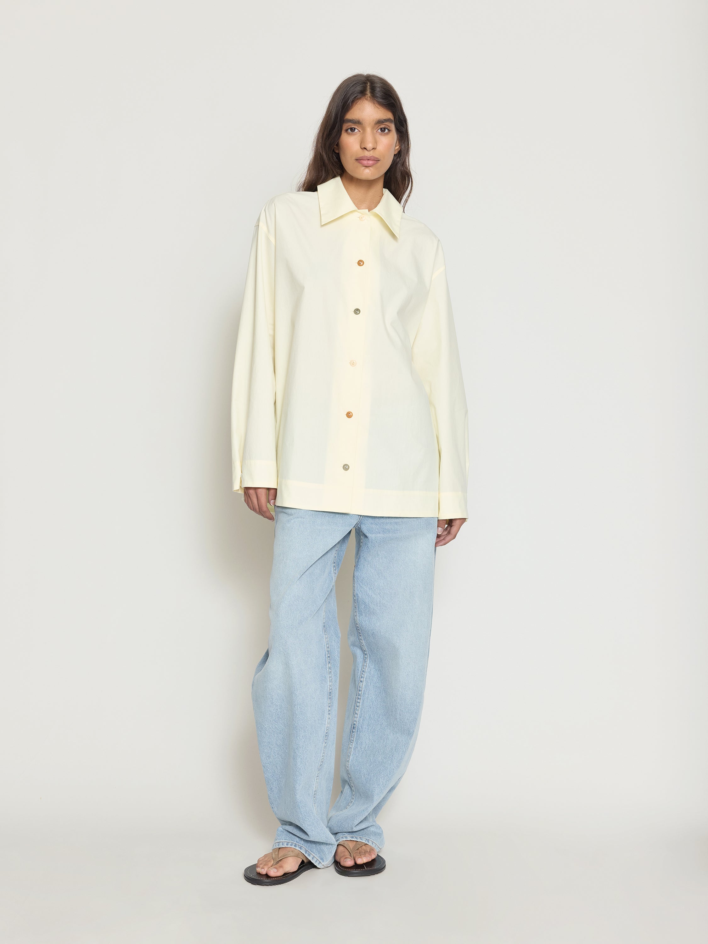 A relaxed fit button down shirt with convertible tie back collar detail. Cut from crisp cotton poplin in a soft 'Opal' green with mixed material buttons.