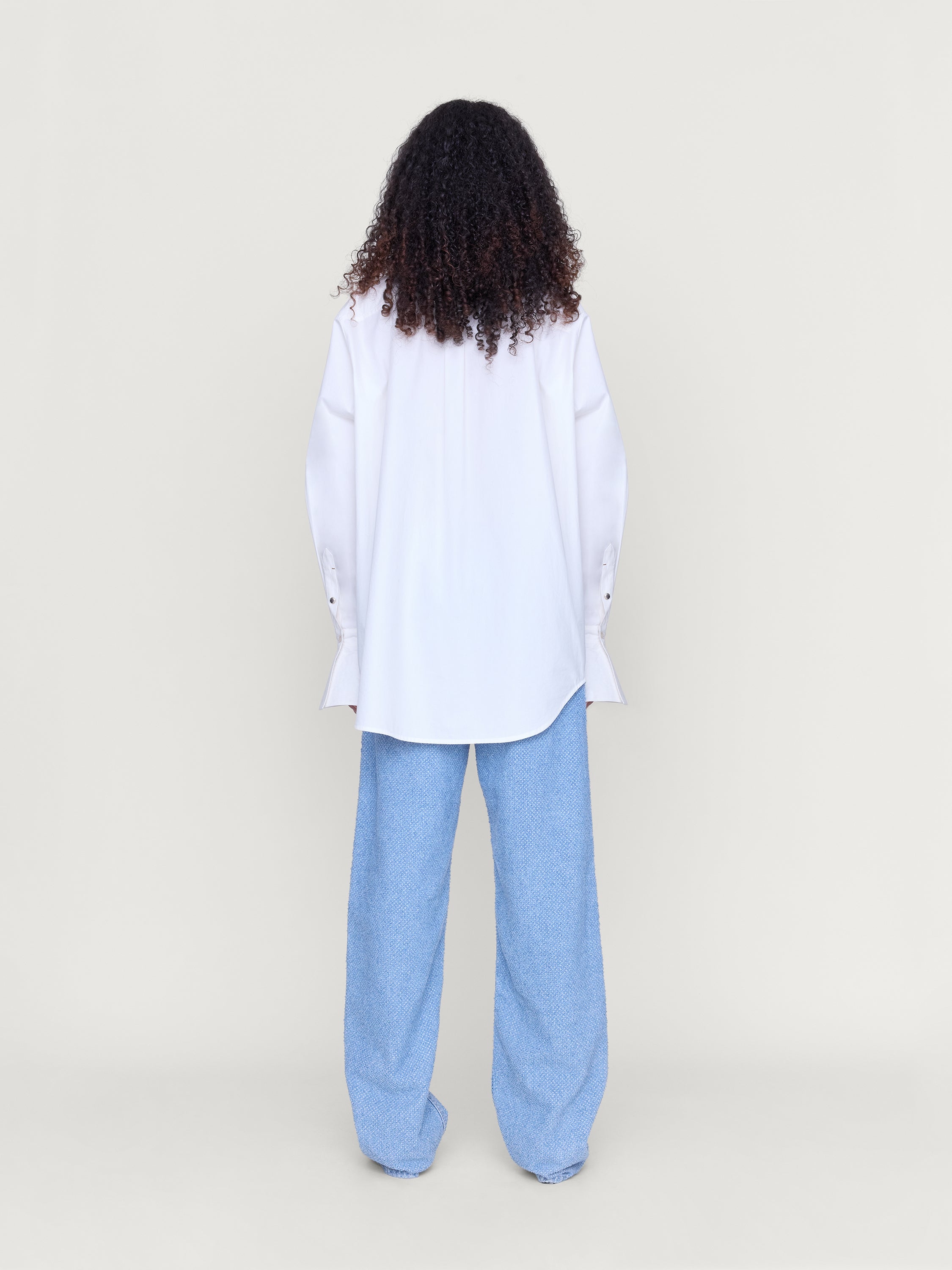A relaxed fit button down shirt with trapunto stitch detailing at the collar and cuff. Cut from crisp cotton poplin with custom nickel snaps at each cuff.