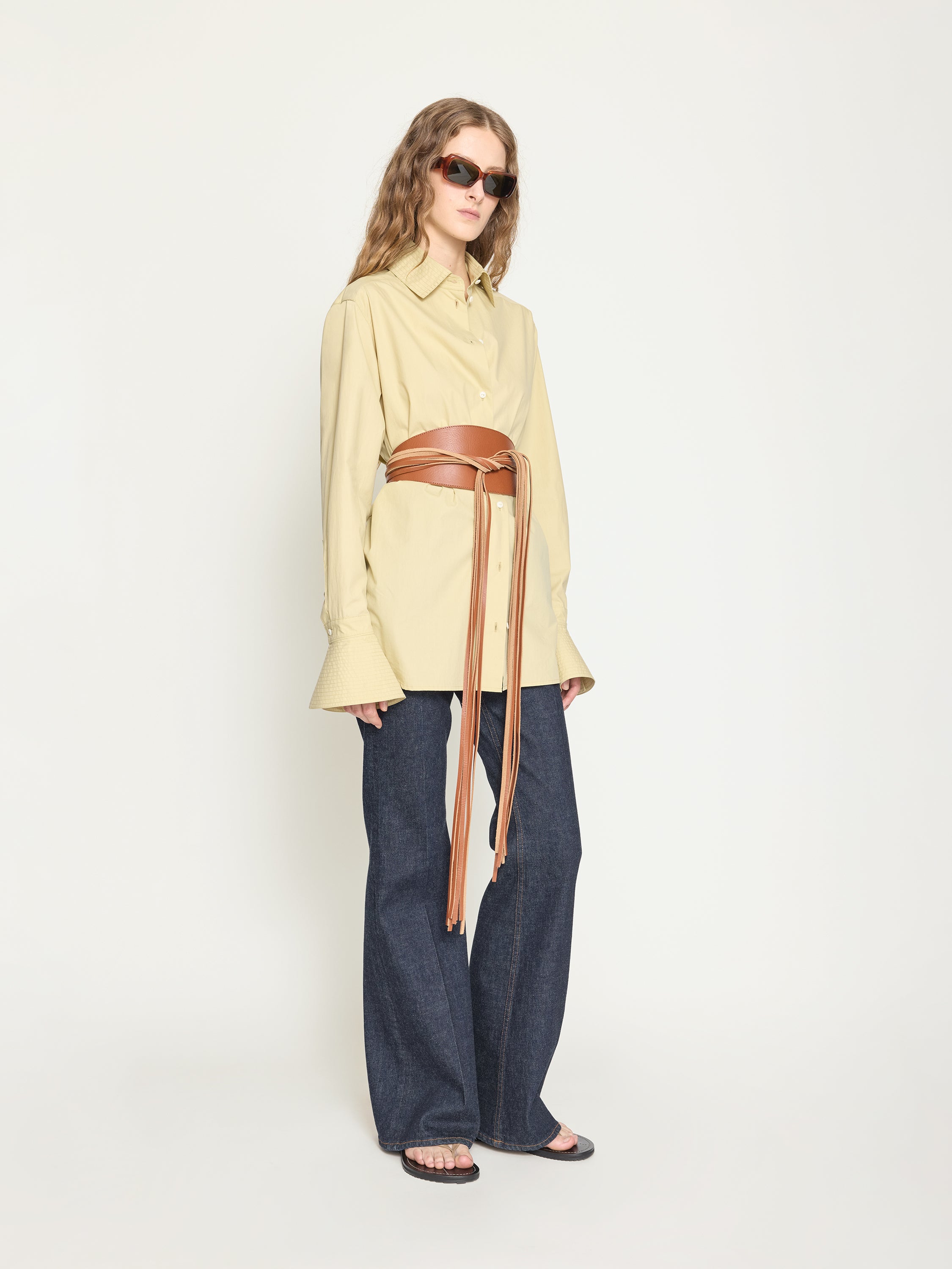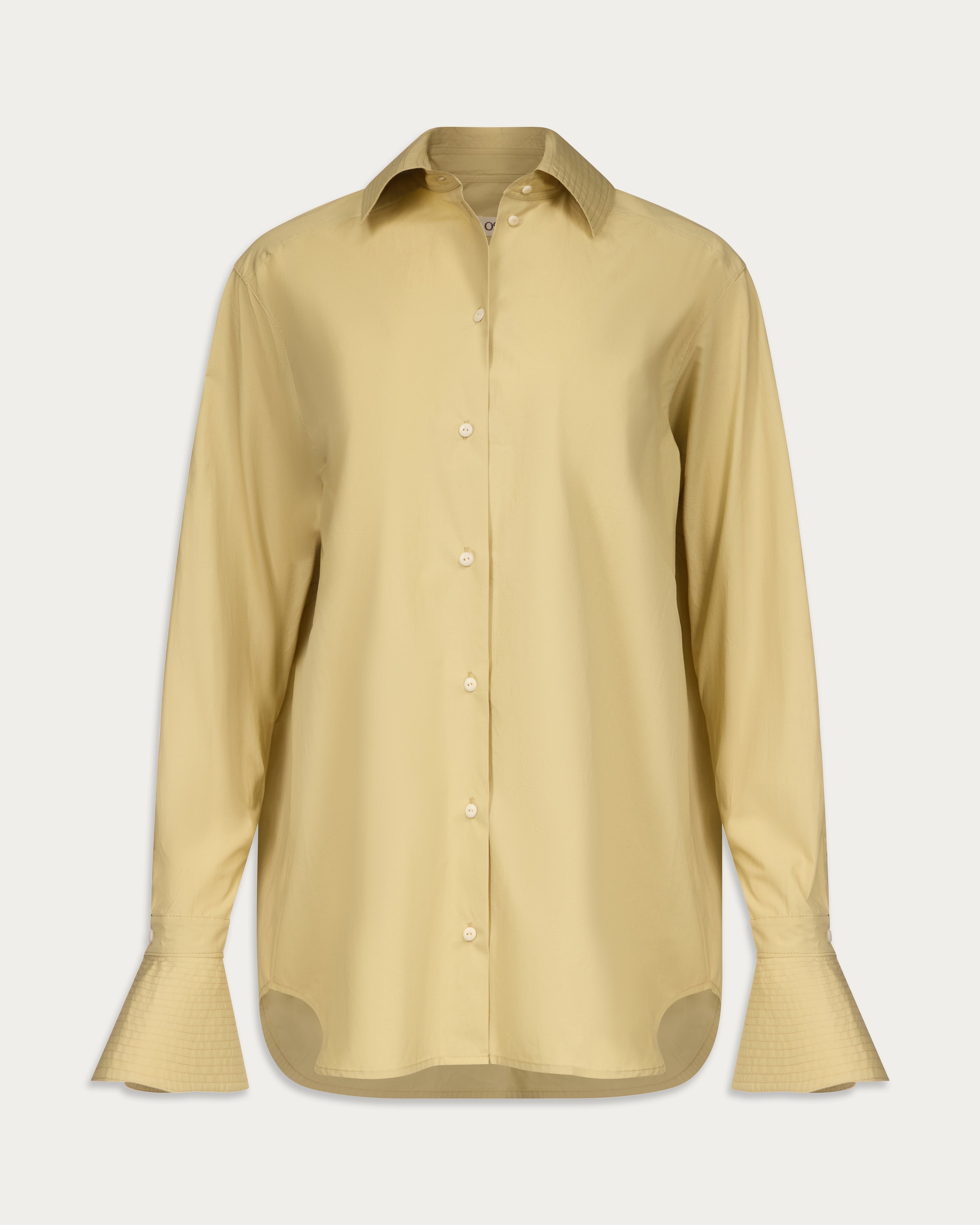 A relaxed fit button down shirt with trapunto stitch detailing at the collar and cuff. Cut from crisp cotton poplin with custom nickel snaps at each cuff.
