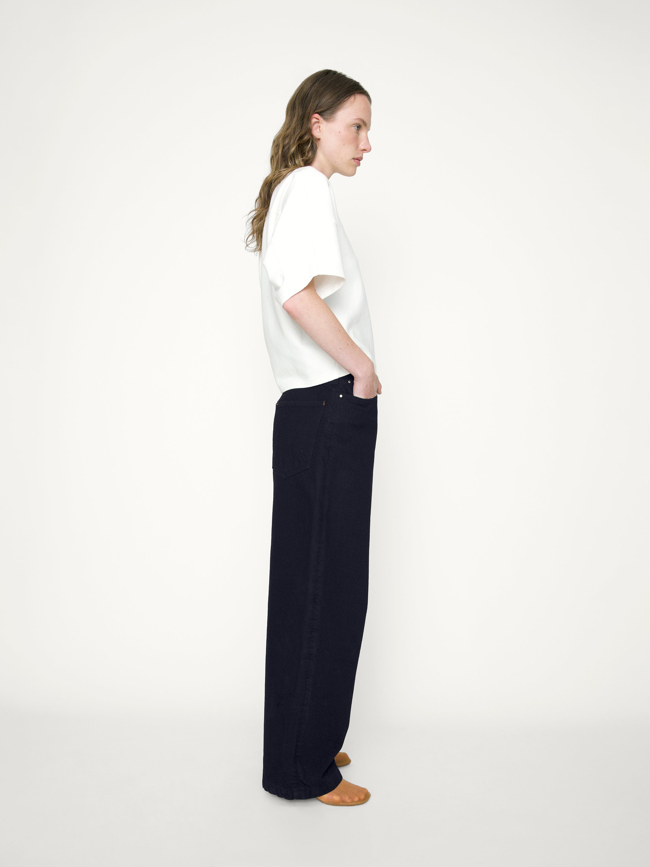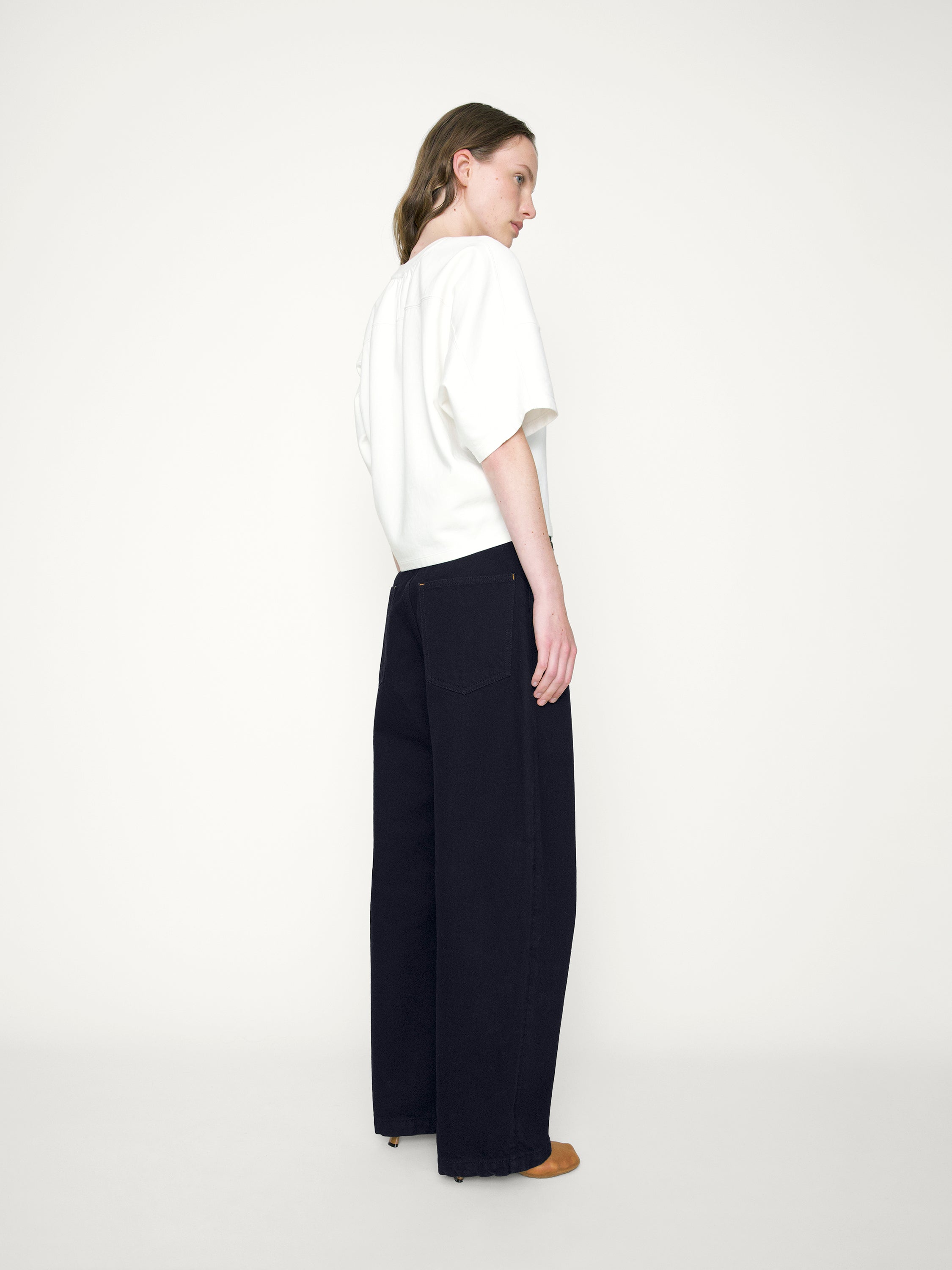 A slightly cropped relaxed fit t-shirt cut in structured cotton jersey. Designed for an architectural yet soft fit with rounded shoulder seam detail.
