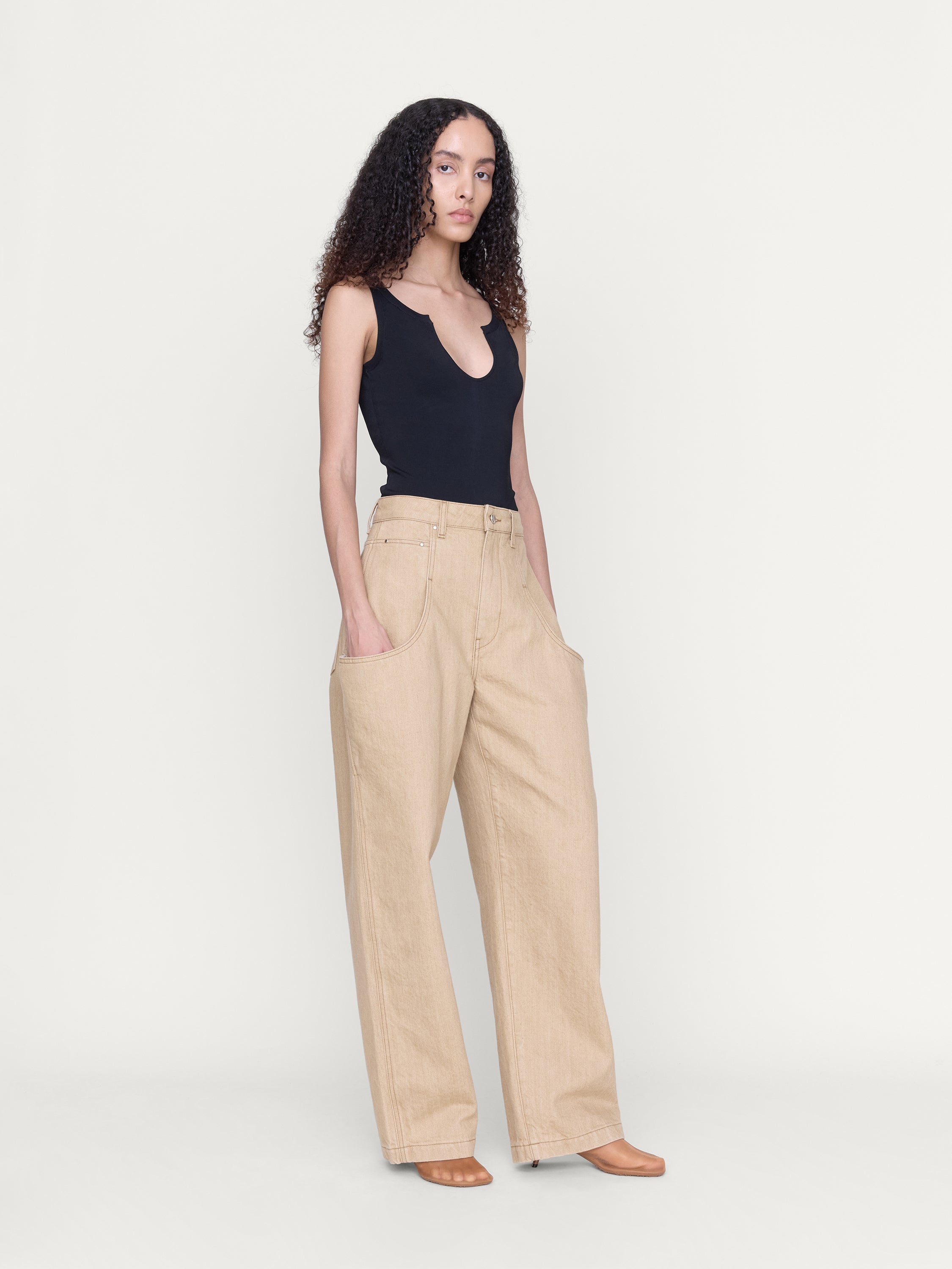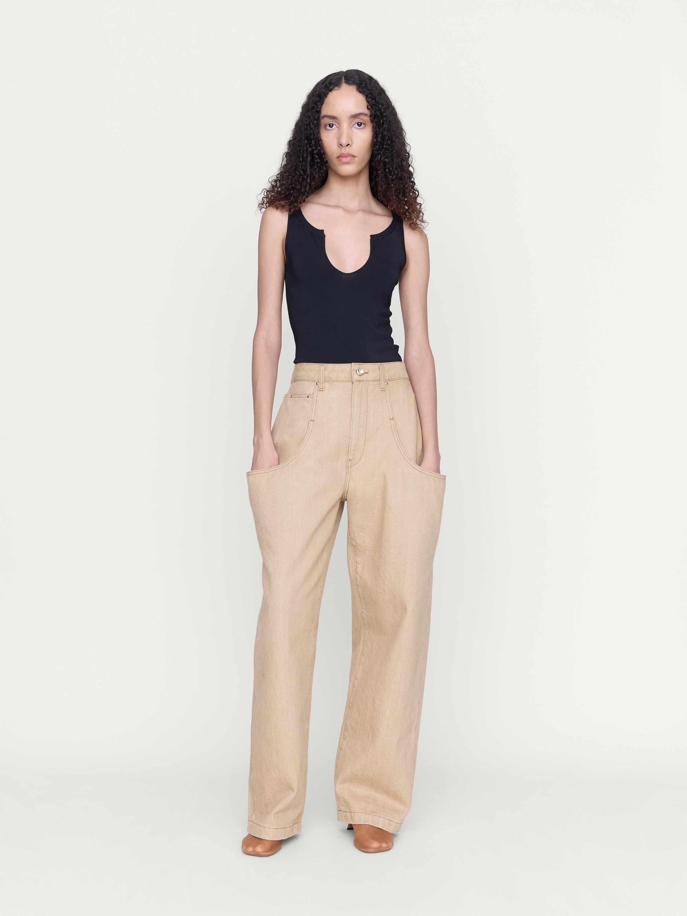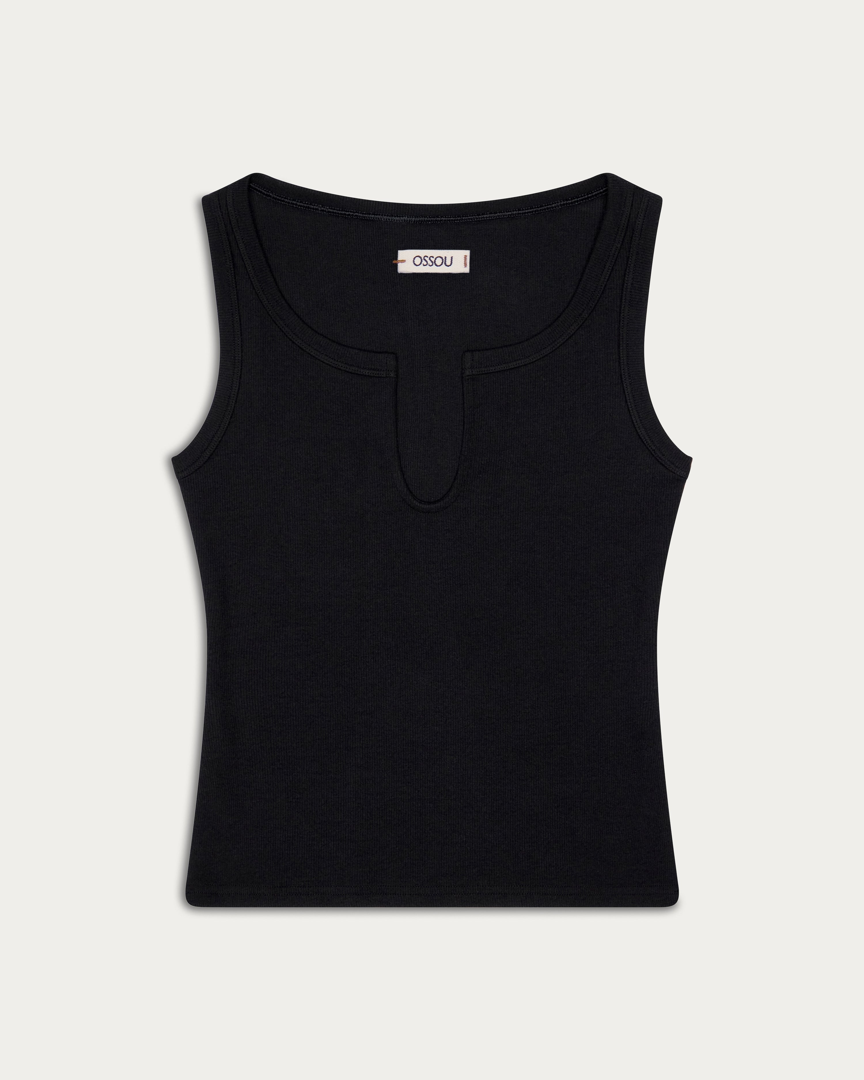 A soft yet durable tank top in stretch cotton rib. Cut for a fitted silhouette with a double scoop neckline.