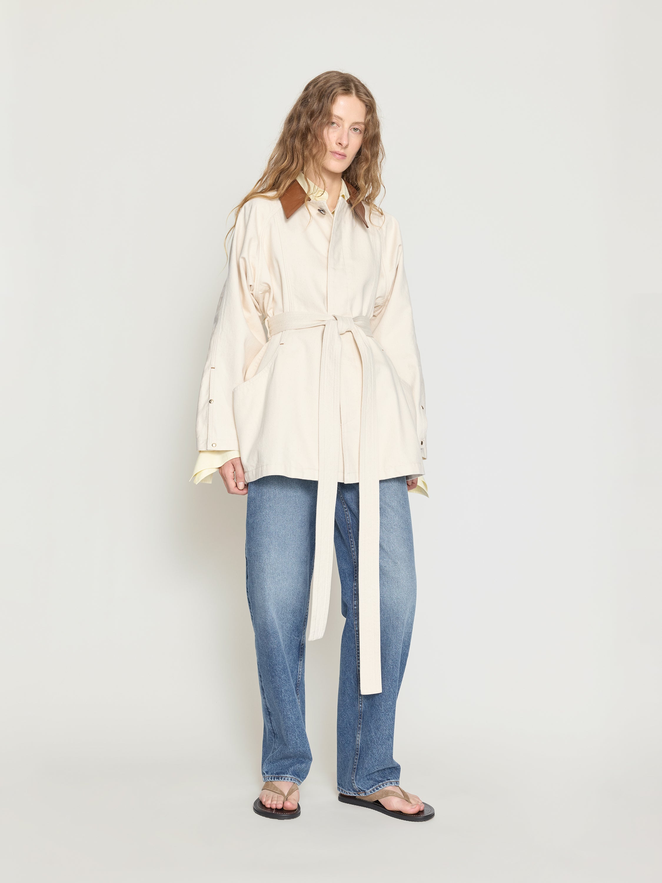A short trench featuring oversized draped pockets, a trapunto-stitched belt, and a contrast leather collar. A refined play of structure and ease.