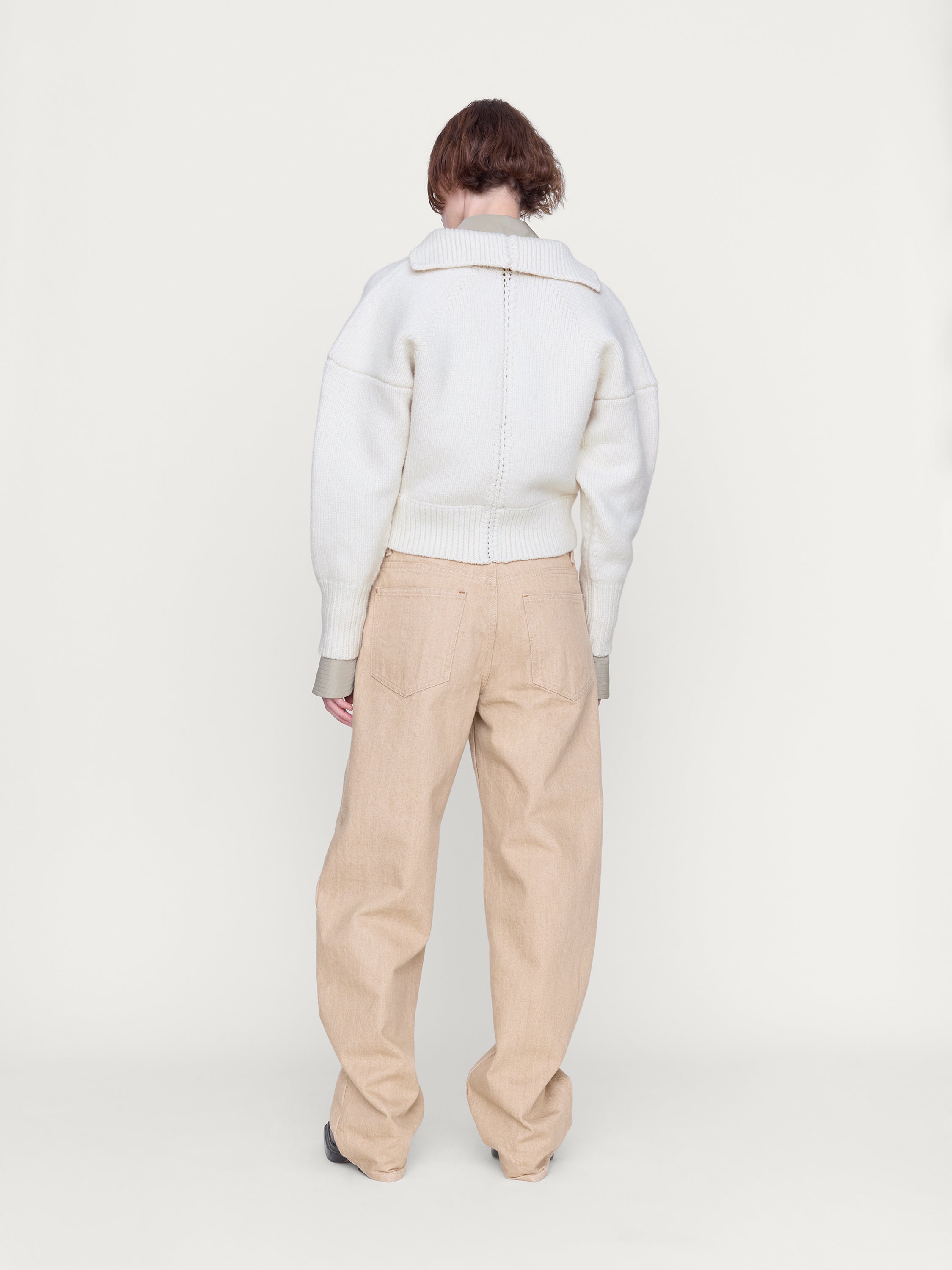 A relaxed v-neck sweater with whipstitch detail and extended collar knitted in an airy chainette wool yarn.
